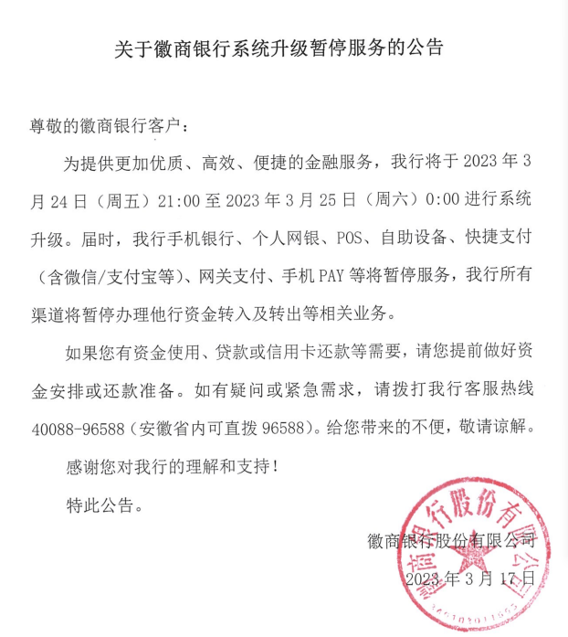 徽商银行将于3月24日(周五)21:00至25日(周六)0:00进行系统升级,期间暂停服务。