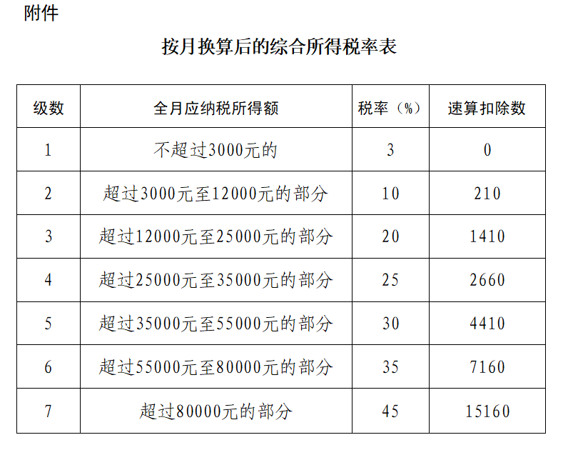 一、居民个人取得全年一次性奖金,符合《国家税务总局关于调整个人取得全年一次性奖金等计算征收个人所得税方法问题的通知》(国税发〔2005〕9号)规定的,不并入当年综合所得,以全年一次性奖金收入除以12个月得到的数额,按照本公告所附按月换算后的综合所得税率表,确定适用税率和速算扣除数,单独计算纳税。计算公式为: