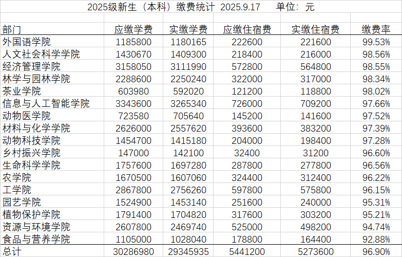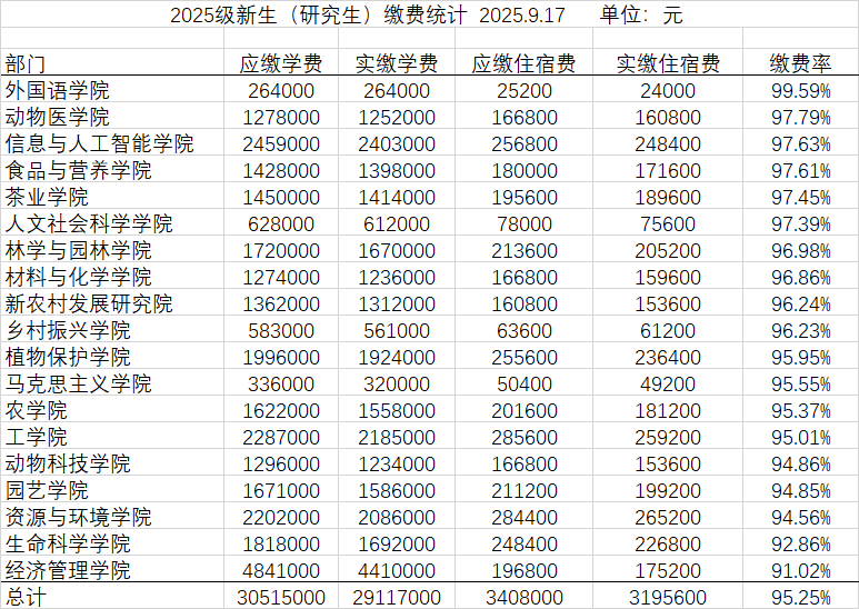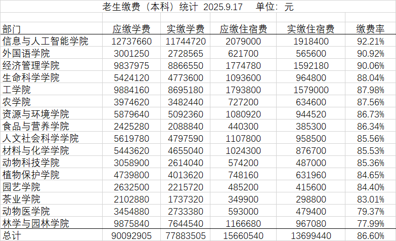 截止到9月17日,应收学费、住宿费21334.3975万元(其中应收学费18501.3885万元 ,应收住宿费2833.0090万元),实收学费、住宿费18689.2810万元(其中实收学费16187.744万元,实收住宿费2501.5370万元),总欠费2645.1165万元。