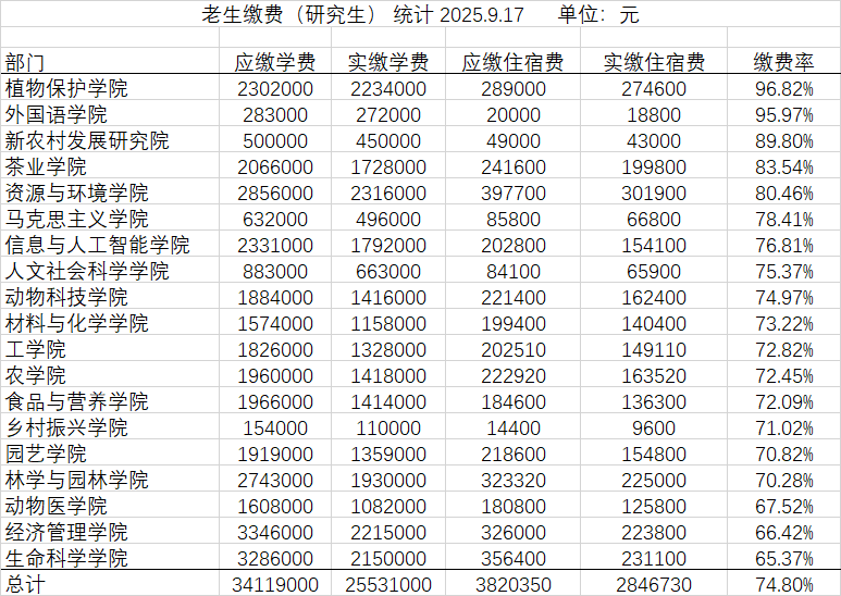 从新老生具体分类来看,新生本科应收学费、住宿费3572.8180万元,实收学费、住宿费3461.9535万元,收缴率96.9% ;新生研究生应收学费、住宿费3392.3000万元,实收学费、住宿费3231.26万元,收缴率95.25% ;老生本科应收学费、住宿费10575.3445万元,实收学费、住宿费9158.2945万元,收缴率86.6%;老生研究生应收学费、住宿费3793.935万元,实收学费、住宿费2837.7730万元,欠费956.1620万元,收缴率74.8%。