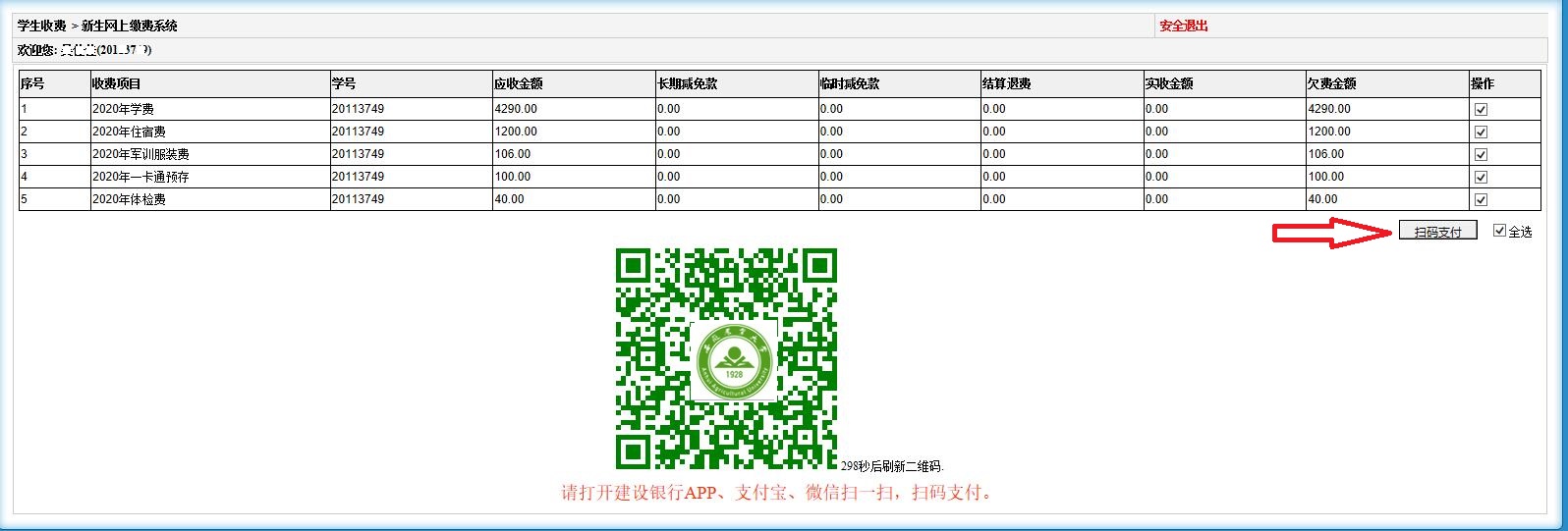 3.点击扫码支付按钮,生成缴费二维码后,可通过手机微信、支付宝、云闪付以及建行APP扫一扫,按手机提示完成缴费。